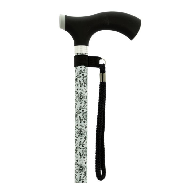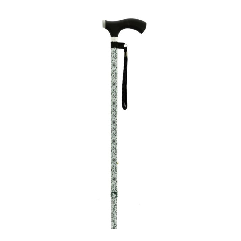 Muletilla extensible de aluminio blanco y flores negras. La empuñadura es de tacto suave negro.