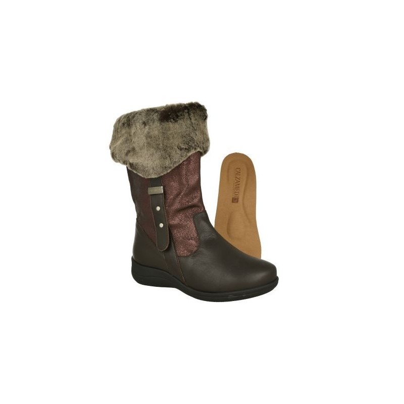 Bota de Calzamedi con doble altura, ya que lo podemos convertir en una bota subiendo toda la embocadura y dejando en el interior su pelo, quedando solo un detalle de pelo en el perfil de entrada.