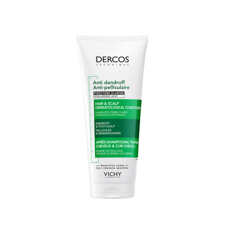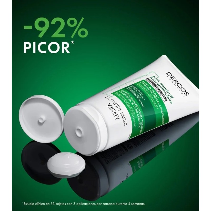 Descubre VICHY DERCOS ANTICASPA cuidado acondicionador para Cabello y Cuero Cabelludo, para eliminar el 77% de la caspa visible* y reducir el picor en un 92%*. Su fórmula hidrata intensamente el cabello y el cuero cabelludo y su eficacia está clínicamente probada en caspa* adherente y rebelde. Tras su aplicación, la barrera del cuero cabelludo mejora* y el cabello se nota más suave con 72 horas de hidratación** y -96% de rotura capilar**. Su fórmula hipoalergénica está indicada para cuero cabelludo sensibles y puede utilizarse en cabellos teñidos**. Su textura fundente es agradable y untuosa*** y mejora el proceso de desenredado.