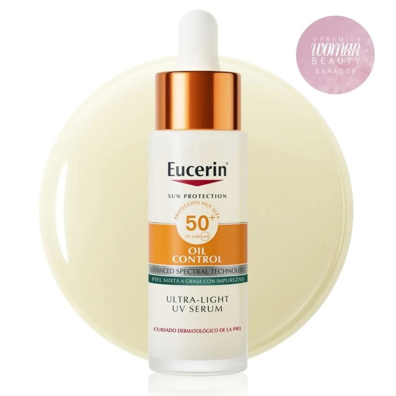 Eucerin® Sun Face Oil Control Serum UV FPS50+ formulado con Tecnología Oil Control para un efecto matificante duradero, y un complejo vitamínico anti-polución que protege frente a los rayos UVA/UVB y la luz azul.