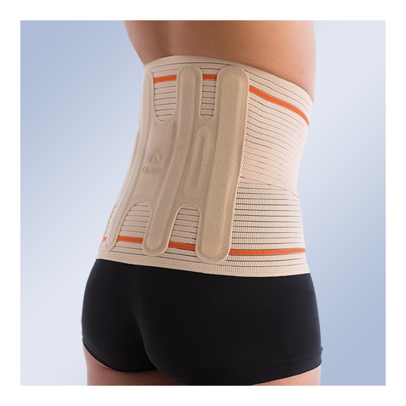 Ortesis sacrolumbar confeccionada con tejido elástico altamente transpirable. Pieza inelástica sacrolumbar que distribuye la descarga y da soporte a la zona. Incorpora cuatro varillas flexibles. Fabricación sin costuras: evita sobrepresiones y maximiza ligereza. Dos amplias trabillas para facilitar la colocación. Cierre mediante micro-velcro. Látex free: hipoalergénica.