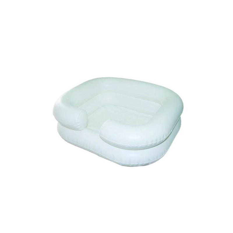 Fabricado en resistente plástico vinilo, posee dos aros hinchables y una abertura para el cuello. Se puede inflar fácilmente sin necesidad de bomba. Incorpora un tubo de drenaje para evacuar el agua. Debido a su diseño acolchado permite reposar el cuello y hombros en este lavacabezas. Ancho: 66cm. Largo: 57cm.