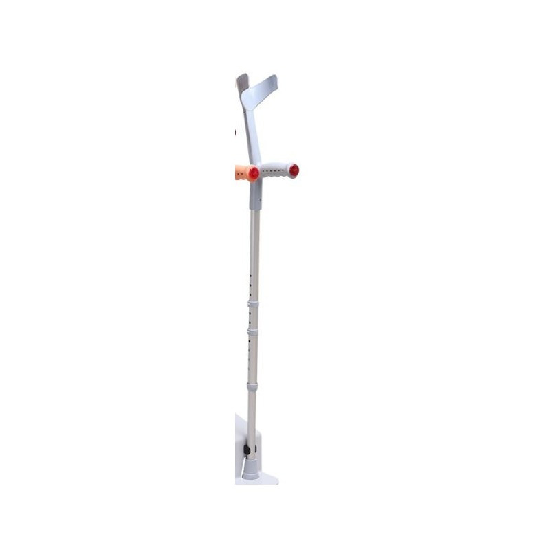 Fabricada en aluminio y empuñaduras de polipropileno. Su codera articulada permite mantener la muleta agarrada al brazo y tener así las manos libres. De esta manera no es necesario apoyar la muleta cuando no se está usando. Sirve para facilitar la marcha y aumentar la estabilidad.