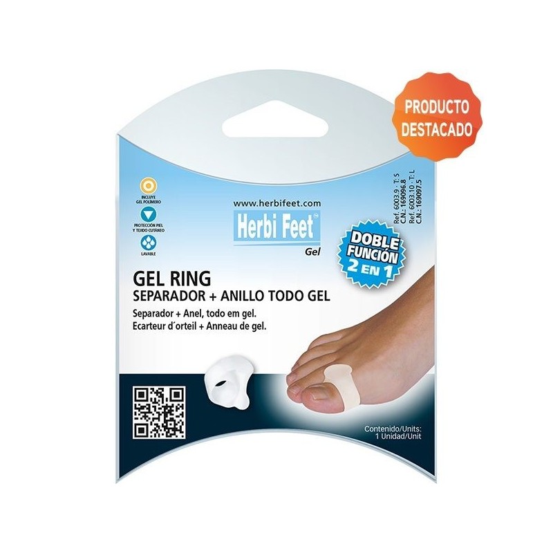 Ofrece protección en helomas y roces interdigitales, ayudando en la alineación de dedos y disminuyendo la fricción. El anillo incorporado evita que el separador se desplace, a la vez que protege también el otro dedo. Diseño anatómico. Su poco grosor evita los rechazos.
