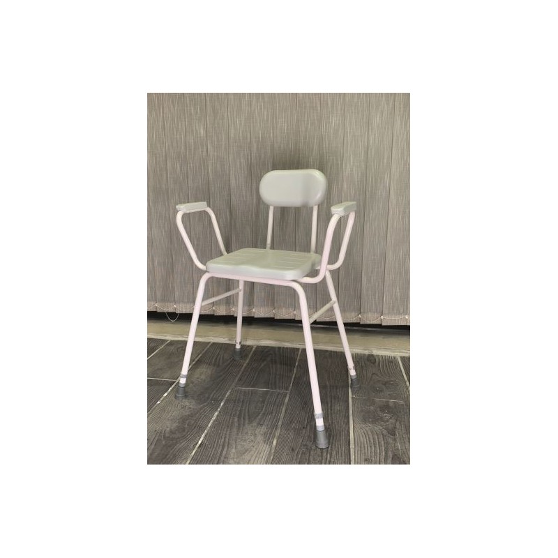 Esta silla de baño con brazos y respaldo es un producto de apoyo para el aseo. Sus reposabrazos acolchados ayudan al agarre e incorporación.
