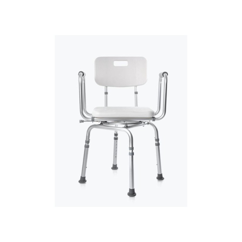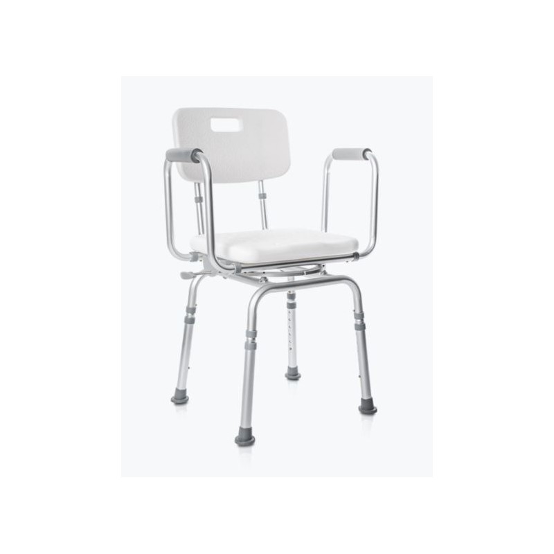 Una práctica silla de ducha que se puede girar en el plato de ducha. Si se ahorra espacio, es más fácil sentarse frente a la puerta y luego girarse. Estructura en acero epoxi y asiento con gran confort.