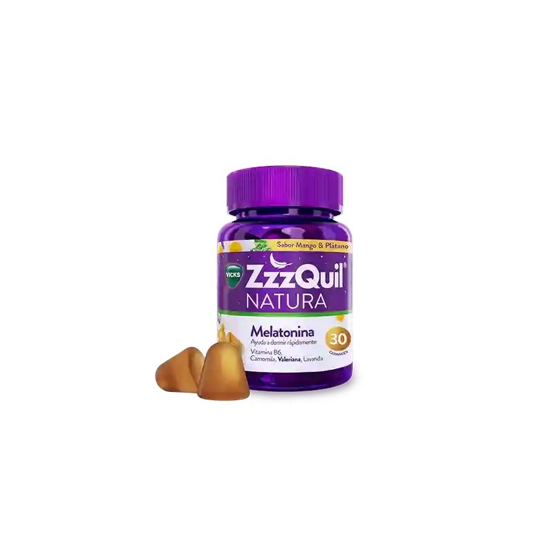 ZzzQuil NATURA es el complemento alimenticio para ayudar a dormir rápidamente. La melatonina actúa en la regulación del ciclo del sueño, reduciendo el tiempo necesario para conciliarlo. El beneficio se obtiene tomando 1 gummy (1 mg de melatonina) poco antes de ir a dormir.