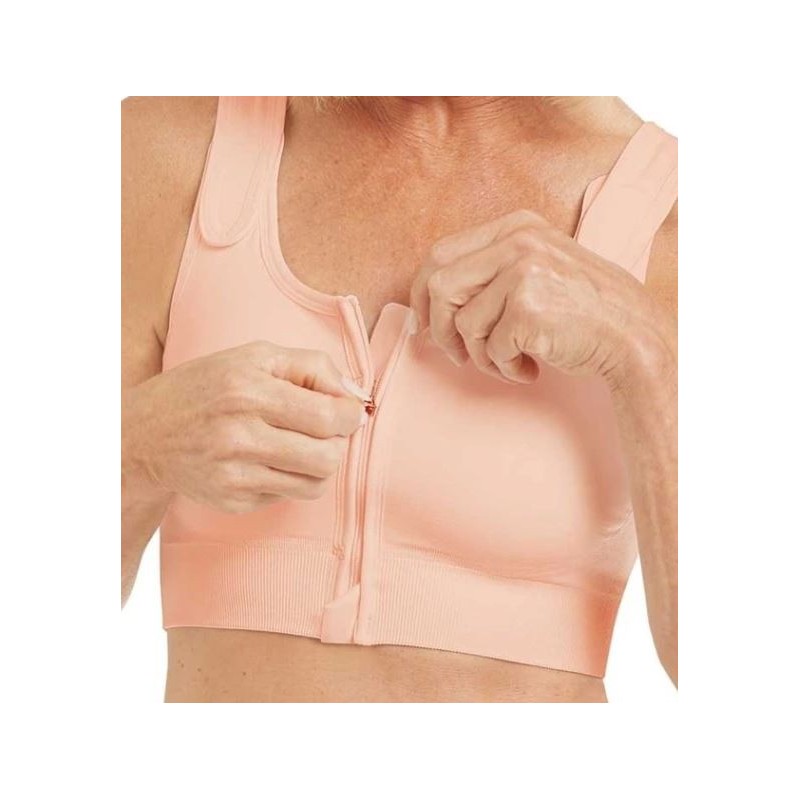 Tirantes anchos ajustables con cierre de bucle gancho para una adaptacióon fácil y confort durante su uso. Forma anatómica confeccionado con tejido resistente y elástico ofreciendo y una compresión cirucular alrededor de la mama. Cierre frontal mediante cremallera para un acceso fácial a la zona quirúrgica. Incororpora una fila de corchetes para mayor seguridad y un protector de cremallera en la banda inferior proporcionando un confort adiciónal. Bolsillos sin costuras para sujetar comodamente la prótesis temporal o Leisure Form. Tejido suave en el centro vertical de la espalda permite colocar el cinturón de compresión para mantenerlo en su posición.