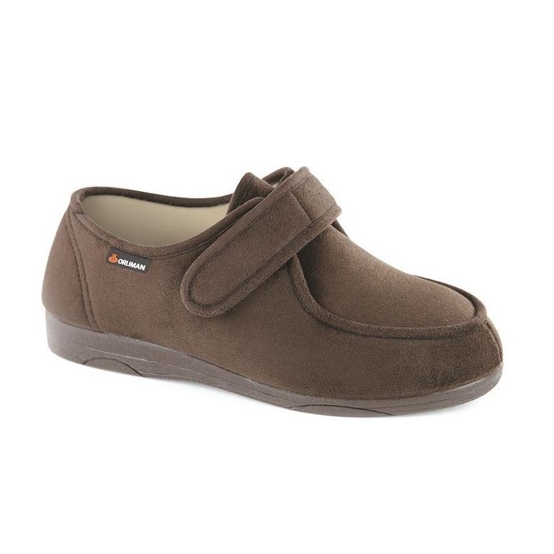 Indicaciones: Pies muy anchos. Empeines pronunciados. Dedos en garra, dedos en martillo. Durezas, callos. Hallux valgus, juanetes. Enfermedades de la uña. Edemas postoperatorios. Vendajes gruesos. Pie reumático y/o artrítico. Metatarsalgía. Composición: Sistema de cierre en poliamida. Material externo: 100% Poliéster. Plantilla interior: Viscoelástica con fibras de poliéster. Forro: Fibras de poliéster. Suela Exterior: Caucho natural, contiene látex. Color: Marrón.