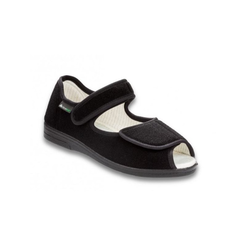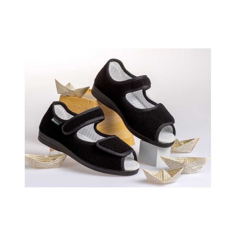 Gran altura en la zona de los dedos para evitar cualquier tipo de roce. Adecuando para dedos en garra. Gran capacidad de calce, incluso en pies con vendajes. Correa trasera de velcro para mayor sujeción y/o estabilidad.. Ideal para pies muy anchos, edematosos, con juanetes o dedos en garra.