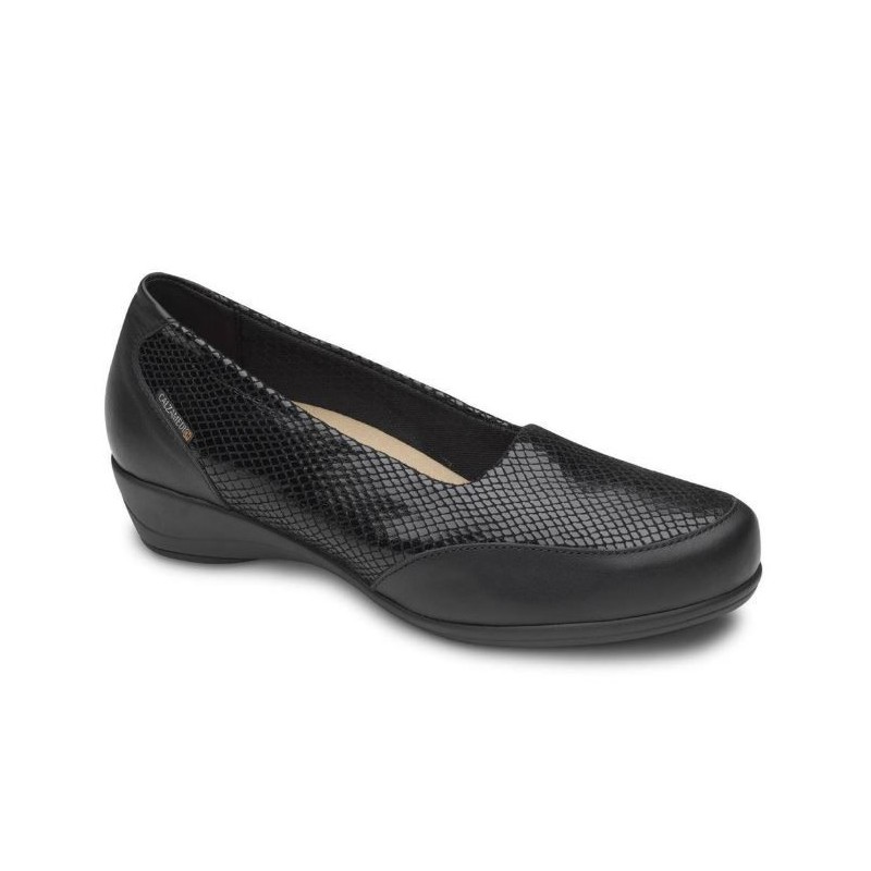 Zapato para mujer de Calzamedi, fabricado en piel con pala elástica de ancho especial 14 y 3 cm de altura de cuña. Plantilla extraíble. Numeración del 35 al 42.