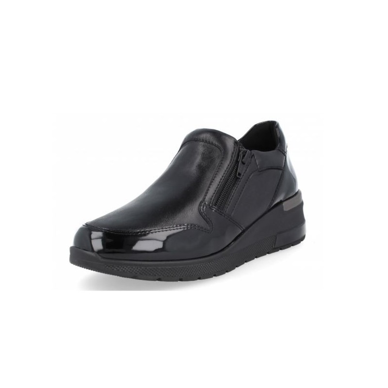 Corte: Zapato de señora de diseño actual, fabricado en piel ovina y charol muy flexible y de muy fácil adaptación, proporcionando además gran elegancia con el máximo confort y adaptabilidad. Las costuras internas estan protegidas, evitando roces o erosiones en pies sensibles.