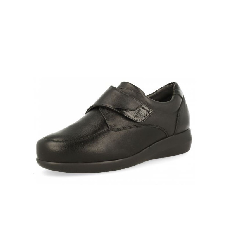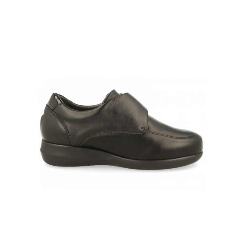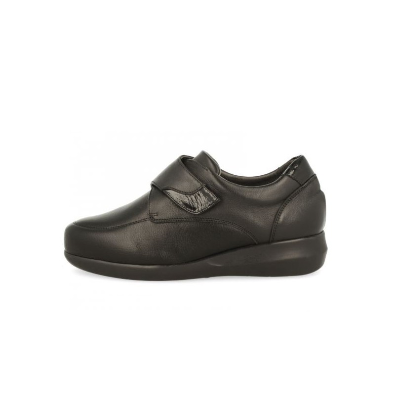 Calzado comfort de señora que garantiza una sensación cómoda durante todo el día. De gran ligereza. El contrafuerte asegura la estructura del calzado y favorece la sujeción del retropié. Horma Fine Confort.